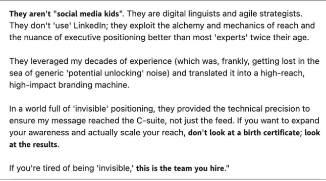 We've worked with LinkedIn "beginners" all the way to 40 year corporate CEO's, business owners and executive coaches. Our system works regardless of your experience or audience level.